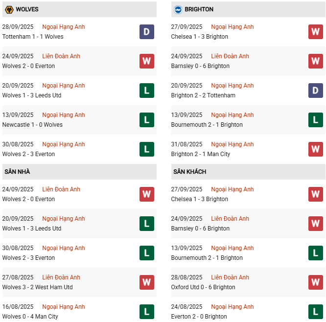Trong 6 lần gặp nhau gần nhất, Brighton thắng 3, Wolves chỉ thắng 1 và có 2 trận hòa. Đáng nói, ở lần chạm trán gần nhất vào tháng 5/2025, Brighton đã giành thắng lợi 2-0 ngay tại Molineux nhờ các pha lập công của Danny Welbeck và Brajan Gruda. Rõ ràng, đội khách đang nắm trong tay lợi thế cả về tinh thần lẫn thống kê.