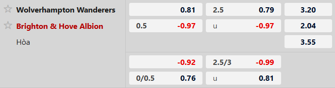 Wolves sẽ tiếp đón Brighton & Hove Albion trên sân nhà Molineux trong khuôn khổ Ngoại hạng Anh. Cả hai đội đều đang có những màn trình diễn đáng chú ý, song xét về phong độ và chất lượng đội hình, Brighton được đánh giá nhỉnh hơn đôi chút.