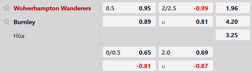 Sàn giao dịch châu Á ghi nhận mức kèo Wolves chấp 1/2 trái, tỷ lệ mà ở trận đối đầu gần nhất xuất hiện chứng kiến họ đánh bại Burnley trên sân nhà của mình. Với thành tích thắng kèo châu Á 3/4 trận gần đây, Wolves có cơ sở để vượt qua Burnley, đội không thắng kèo 2 trận sân khách gần nhất.
