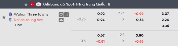 Thầy trò HLV Li Guoxu được xếp trên với kèo chấp 1/4 bàn, một sự khác biệt hoàn toàn nếu so với mùa trước khi họ bị xếp dưới lúc làm khách của Wuhan Three Towns (+1/2). Đây hiển nhiên là điểm tiêu cực với Wuhan Three Towns khi chưa bao giờ họ bị xếp dưới trên sân nhà trước một đối thủ cũng chỉ tầm trung, lại không quá nổi bật về phong độ. Xem ra đội thắng trận này đã được ấn định từ lúc bóng chưa lăn.