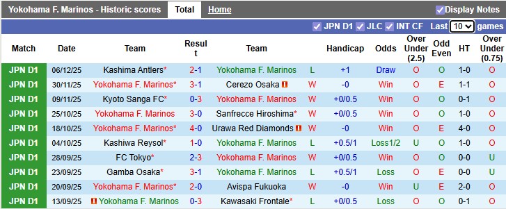 Tuy vậy, giai đoạn cuối mùa lại cho thấy những tín hiệu tích cực khi Yokohama Marinos thắng 6 và thua 4 trong 10 trận gần nhất, phần nào lấy lại sự tự tin. Trên sân nhà, phong độ của họ cũng ở mức chấp nhận được với 5 chiến thắng, 1 trận hòa và 4 thất bại trong 10 lần đón khách gần đây. Điểm mạnh quen thuộc của Yokohama Marinos vẫn nằm ở lối chơi cởi mở, sẵn sàng đẩy cao đội hình, nhưng điểm yếu cố hữu là hàng thủ thiếu chắc chắn.