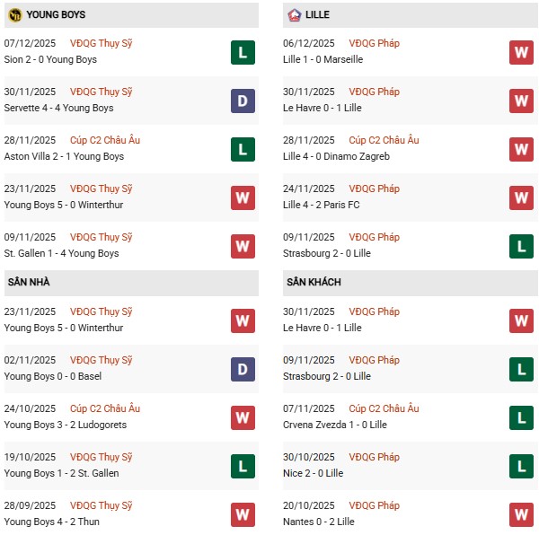 Trước cuộc đối đầu với Lille, Young Boys bất bại trong 3 trận đấu gần nhất trên sân nhà, giữ sạch lưới trong 2 trận liên tiếp. Young Boys mới chỉ giành được 2 chiến thắng trước các đối thủ Pháp trong lịch sử, cả hai đều trên sân nhà, lần gần nhất là vào năm 1963 trước Toulouse tại UEFA Intertoto Cup (3-2).